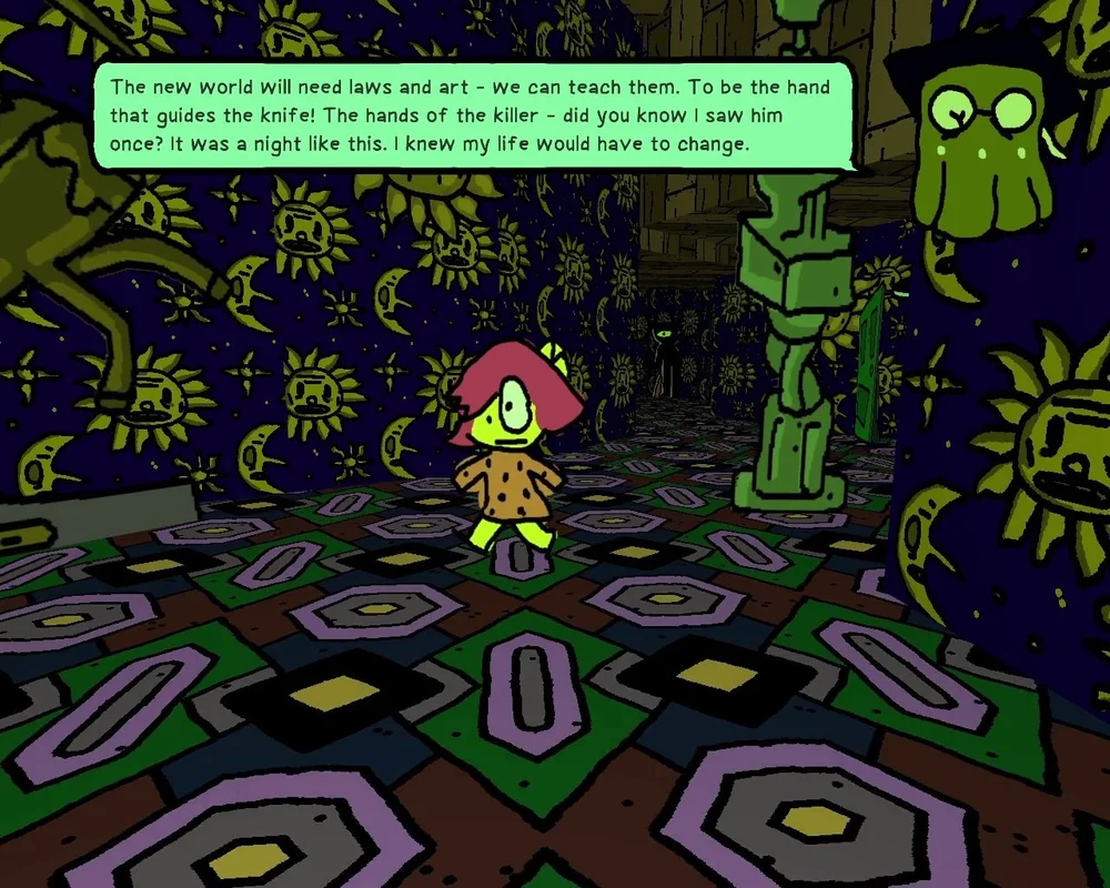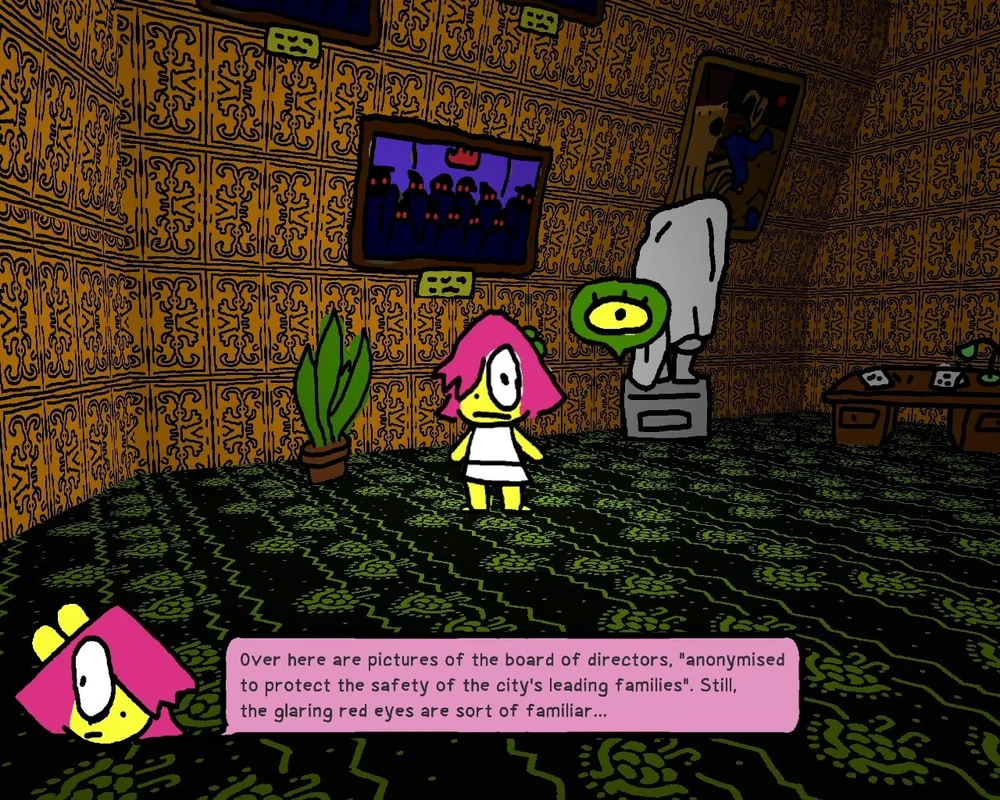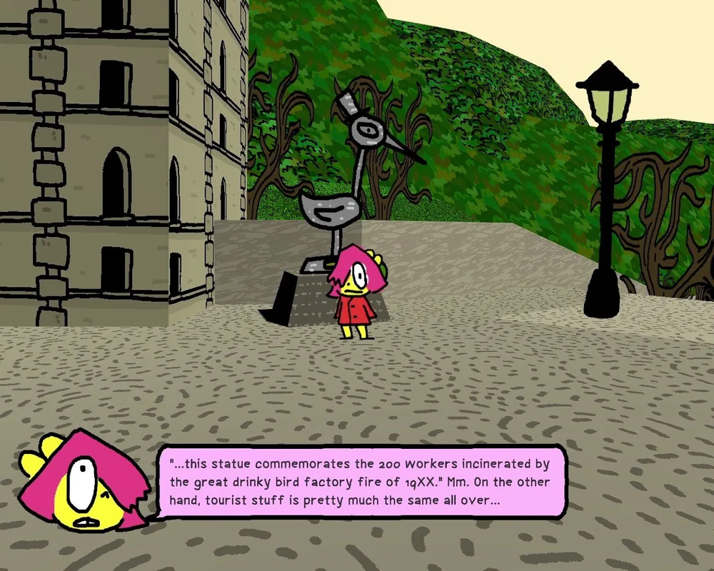 This scene occurs in “Heart of the Killer.” It is the eighth installment of Anthology of the Killer, a series of comedy-horror cartoon adventure games released from 2020 to 2024 by Space Funeral (2003) creator Stephen Gillmurphy. The player controls BB, a college student in XX City who reports on mysteries in her Strange Town zine, wandering through environments dense with scripted dialogue (even the chase scenes stay wordy). Invariably, BB discovers that another aspect of the city’s culture and civil society has been corrupted into an irrational murder conspiracy under the influence of a bird-headed arsonist known only as the Killer.
